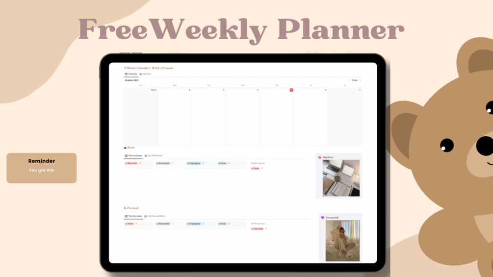 - 🗓️ A master calendar is included . Work and personal tasks are connected to the master calendar so any post you create on work or personal, it is automatically displayed in the master calendar.